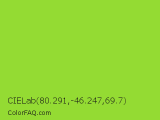CIELab 80.291,-46.247,69.7 Color is a normal green color and the nearest color is Yellow Green #9acd32. Hex code #94db33 and RGB value is rgb(148,219,51). In RGB color space, this color is composed of 58% red, 86% green, 20% blue, In CMYK color space, this color is composed of 32% cyan, 0% magenta, 77% yellow , 14% black , In HSL color space, this color has a hue angle of 85° , 70% saturation and 53% lightness.