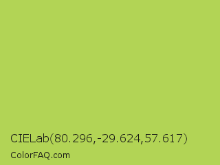 CIELab 80.296,-29.624,57.617 Color is a normal lime color and the nearest color is June Bud #bdda57. Hex code #b2d455 and RGB value is rgb(178,212,85). In RGB color space, this color is composed of 70% red, 83% green, 33% blue, In CMYK color space, this color is composed of 16% cyan, 0% magenta, 60% yellow , 17% black , In HSL color space, this color has a hue angle of 76° , 60% saturation and 58% lightness.