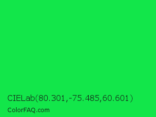 CIELab 80.301,-75.485,60.601 Color is a normal green color and the nearest color is Malachite #0bda51. Hex code #12e64a and RGB value is rgb(18,230,74). In RGB color space, this color is composed of 7% red, 90% green, 29% blue, In CMYK color space, this color is composed of 92% cyan, 0% magenta, 68% yellow , 10% black , In HSL color space, this color has a hue angle of 136° , 85% saturation and 49% lightness.