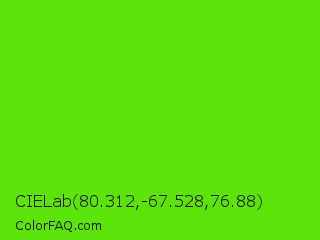 CIELab 80.312,-67.528,76.88 Color is a normal green color and the nearest color is Bright Green #66ff00. Hex code #5ce30a and RGB value is rgb(92,227,10). In RGB color space, this color is composed of 36% red, 89% green, 4% blue, In CMYK color space, this color is composed of 59% cyan, 0% magenta, 96% yellow , 11% black , In HSL color space, this color has a hue angle of 97° , 92% saturation and 46% lightness.