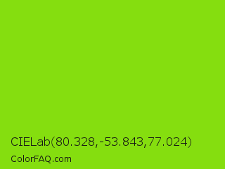CIELab 80.328,-53.843,77.024 Color is a normal green color and the nearest color is Alien Armpit #84de02. Hex code #85de0f and RGB value is rgb(133,222,15). In RGB color space, this color is composed of 52% red, 87% green, 6% blue, In CMYK color space, this color is composed of 40% cyan, 0% magenta, 93% yellow , 13% black , In HSL color space, this color has a hue angle of 86° , 87% saturation and 46% lightness.