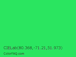 CIELab 80.368,-71.21,51.973 Color is a normal green color and the nearest color is UFO Green #3cd070. Hex code #29e55f and RGB value is rgb(41,229,95). In RGB color space, this color is composed of 16% red, 90% green, 37% blue, In CMYK color space, this color is composed of 82% cyan, 0% magenta, 59% yellow , 10% black , In HSL color space, this color has a hue angle of 137° , 78% saturation and 53% lightness.