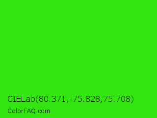 CIELab 80.371,-75.828,75.708 Color is a normal green color and the nearest color is Neon Green #39ff14. Hex code #33e612 and RGB value is rgb(51,230,18). In RGB color space, this color is composed of 20% red, 90% green, 7% blue, In CMYK color space, this color is composed of 78% cyan, 0% magenta, 92% yellow , 10% black , In HSL color space, this color has a hue angle of 111° , 85% saturation and 49% lightness.