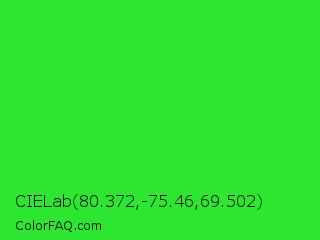 CIELab 80.372,-75.46,69.502 Color is a normal green color and the nearest color is Lime Green #32cd32. Hex code #2ce630 and RGB value is rgb(44,230,48). In RGB color space, this color is composed of 17% red, 90% green, 19% blue, In CMYK color space, this color is composed of 81% cyan, 0% magenta, 79% yellow , 10% black , In HSL color space, this color has a hue angle of 121° , 79% saturation and 54% lightness.