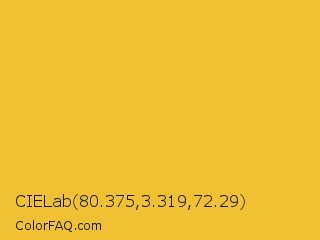 CIELab 80.375,3.319,72.29 Color is a normal orange color and the nearest color is Saffron #f4c430. Hex code #f0c233 and RGB value is rgb(240,194,51). In RGB color space, this color is composed of 94% red, 76% green, 20% blue, In CMYK color space, this color is composed of 0% cyan, 19% magenta, 79% yellow , 6% black , In HSL color space, this color has a hue angle of 45° , 86% saturation and 57% lightness.