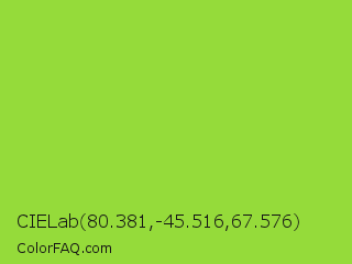 CIELab 80.381,-45.516,67.576 Color is a normal green color and the nearest color is Kiwi #8ee53f. Hex code #95db3a and RGB value is rgb(149,219,58). In RGB color space, this color is composed of 58% red, 86% green, 23% blue, In CMYK color space, this color is composed of 32% cyan, 0% magenta, 74% yellow , 14% black , In HSL color space, this color has a hue angle of 86° , 69% saturation and 54% lightness.