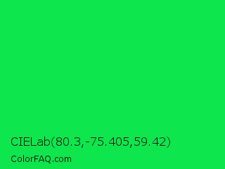 CIELab 80.3,-75.405,59.42 Color is a normal green color and the nearest color is Malachite #0bda51. Hex code #0de64d and RGB value is rgb(13,230,77). In RGB color space, this color is composed of 5% red, 90% green, 30% blue, In CMYK color space, this color is composed of 94% cyan, 0% magenta, 67% yellow , 10% black , In HSL color space, this color has a hue angle of 138° , 89% saturation and 48% lightness.
