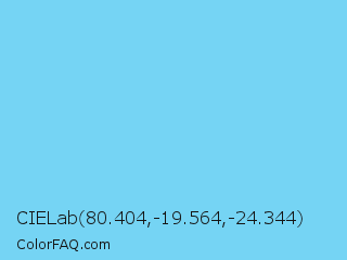 CIELab 80.404,-19.564,-24.344 Color is a light blue color and the nearest color is Sky Blue #76d7ea. Hex code #75d4f4 and RGB value is rgb(117,212,244). In RGB color space, this color is composed of 46% red, 83% green, 96% blue, In CMYK color space, this color is composed of 52% cyan, 13% magenta, 0% yellow , 4% black , In HSL color space, this color has a hue angle of 195° , 85% saturation and 71% lightness.