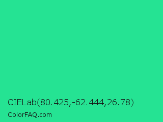 CIELab 80.425,-62.444,26.78 Color is a normal green color and the nearest color is Shamrock #33cc99. Hex code #25e393 and RGB value is rgb(37,227,147). In RGB color space, this color is composed of 15% red, 89% green, 58% blue, In CMYK color space, this color is composed of 84% cyan, 0% magenta, 35% yellow , 11% black , In HSL color space, this color has a hue angle of 155° , 77% saturation and 52% lightness.
