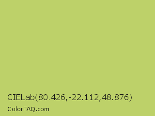 CIELab 80.426,-22.112,48.876 Color is a light lime color and the nearest color is Wild Willow #b9c46a. Hex code #bdd169 and RGB value is rgb(189,209,105). In RGB color space, this color is composed of 74% red, 82% green, 41% blue, In CMYK color space, this color is composed of 10% cyan, 0% magenta, 50% yellow , 18% black , In HSL color space, this color has a hue angle of 72° , 53% saturation and 62% lightness.