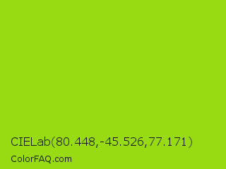 CIELab 80.448,-45.526,77.171 Color is a normal green color and the nearest color is Vivid Lime Green #a6d608. Hex code #99db12 and RGB value is rgb(153,219,18). In RGB color space, this color is composed of 60% red, 86% green, 7% blue, In CMYK color space, this color is composed of 30% cyan, 0% magenta, 92% yellow , 14% black , In HSL color space, this color has a hue angle of 80° , 85% saturation and 46% lightness.