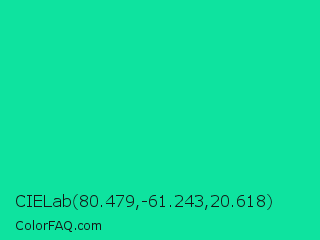CIELab 80.479,-61.243,20.618 Color is a normal green color and the nearest color is Medium Spring Green #00fa9a. Hex code #0ee39f and RGB value is rgb(14,227,159). In RGB color space, this color is composed of 5% red, 89% green, 62% blue, In CMYK color space, this color is composed of 94% cyan, 0% magenta, 30% yellow , 11% black , In HSL color space, this color has a hue angle of 161° , 88% saturation and 47% lightness.