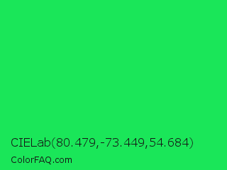 CIELab 80.479,-73.449,54.684 Color is a normal green color and the nearest color is Malachite #0bda51. Hex code #1ae659 and RGB value is rgb(26,230,89). In RGB color space, this color is composed of 10% red, 90% green, 35% blue, In CMYK color space, this color is composed of 89% cyan, 0% magenta, 61% yellow , 10% black , In HSL color space, this color has a hue angle of 139° , 80% saturation and 50% lightness.