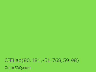 CIELab 80.481,-51.768,59.98 Color is a normal green color and the nearest color is Kiwi #8ee53f. Hex code #82de4e and RGB value is rgb(130,222,78). In RGB color space, this color is composed of 51% red, 87% green, 31% blue, In CMYK color space, this color is composed of 41% cyan, 0% magenta, 65% yellow , 13% black , In HSL color space, this color has a hue angle of 98° , 69% saturation and 59% lightness.