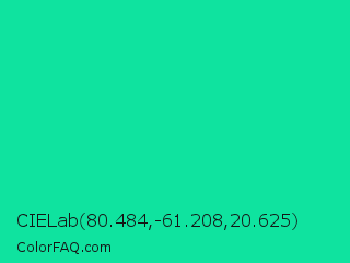 CIELab 80.484,-61.208,20.625 Color is a normal green color and the nearest color is Medium Spring Green #00fa9a. Hex code #0fe39f and RGB value is rgb(15,227,159). In RGB color space, this color is composed of 6% red, 89% green, 62% blue, In CMYK color space, this color is composed of 93% cyan, 0% magenta, 30% yellow , 11% black , In HSL color space, this color has a hue angle of 161° , 88% saturation and 47% lightness.