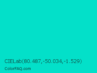 CIELab 80.487,-50.034,-1.529 Color is a normal cyan color and the nearest color is Dark Turquoise #00ced1. Hex code #03e0c9 and RGB value is rgb(3,224,201). In RGB color space, this color is composed of 1% red, 88% green, 79% blue, In CMYK color space, this color is composed of 99% cyan, 0% magenta, 10% yellow , 12% black , In HSL color space, this color has a hue angle of 174° , 97% saturation and 45% lightness.