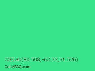 CIELab 80.508,-62.33,31.526 Color is a normal green color and the nearest color is Shamrock #33cc99. Hex code #37e38a and RGB value is rgb(55,227,138). In RGB color space, this color is composed of 22% red, 89% green, 54% blue, In CMYK color space, this color is composed of 76% cyan, 0% magenta, 39% yellow , 11% black , In HSL color space, this color has a hue angle of 149° , 75% saturation and 55% lightness.