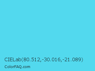 CIELab 80.512,-30.016,-21.089 Color is a light cyan color and the nearest color is Turquoise Blue #6cdae7. Hex code #52d9ee and RGB value is rgb(82,217,238). In RGB color space, this color is composed of 32% red, 85% green, 93% blue, In CMYK color space, this color is composed of 66% cyan, 9% magenta, 0% yellow , 7% black , In HSL color space, this color has a hue angle of 188° , 82% saturation and 63% lightness.