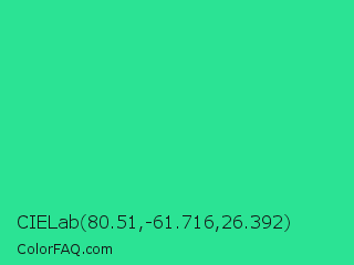 CIELab 80.51,-61.716,26.392 Color is a normal green color and the nearest color is Shamrock #33cc99. Hex code #2be394 and RGB value is rgb(43,227,148). In RGB color space, this color is composed of 17% red, 89% green, 58% blue, In CMYK color space, this color is composed of 81% cyan, 0% magenta, 35% yellow , 11% black , In HSL color space, this color has a hue angle of 154° , 77% saturation and 53% lightness.