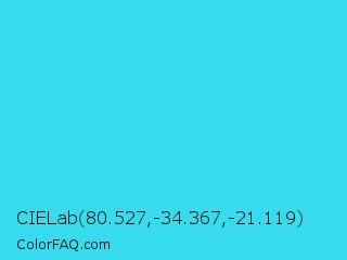 CIELab 80.527,-34.367,-21.119 Color is a normal cyan color and the nearest color is Turquoise #40e0d0. Hex code #36dbee and RGB value is rgb(54,219,238). In RGB color space, this color is composed of 21% red, 86% green, 93% blue, In CMYK color space, this color is composed of 77% cyan, 8% magenta, 0% yellow , 7% black , In HSL color space, this color has a hue angle of 186° , 84% saturation and 57% lightness.