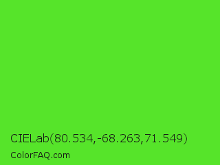 CIELab 80.534,-68.263,71.549 Color is a normal green color and the nearest color is Harlequin Green #46cb18. Hex code #56e42a and RGB value is rgb(86,228,42). In RGB color space, this color is composed of 34% red, 89% green, 16% blue, In CMYK color space, this color is composed of 62% cyan, 0% magenta, 82% yellow , 11% black , In HSL color space, this color has a hue angle of 106° , 78% saturation and 53% lightness.