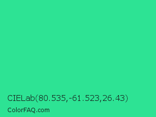 CIELab 80.535,-61.523,26.43 Color is a normal green color and the nearest color is Shamrock #33cc99. Hex code #2de394 and RGB value is rgb(45,227,148). In RGB color space, this color is composed of 18% red, 89% green, 58% blue, In CMYK color space, this color is composed of 80% cyan, 0% magenta, 35% yellow , 11% black , In HSL color space, this color has a hue angle of 154° , 76% saturation and 53% lightness.