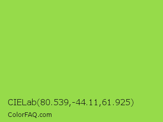 CIELab 80.539,-44.11,61.925 Color is a normal green color and the nearest color is Kiwi #8ee53f. Hex code #96db4a and RGB value is rgb(150,219,74). In RGB color space, this color is composed of 59% red, 86% green, 29% blue, In CMYK color space, this color is composed of 32% cyan, 0% magenta, 66% yellow , 14% black , In HSL color space, this color has a hue angle of 89° , 67% saturation and 57% lightness.