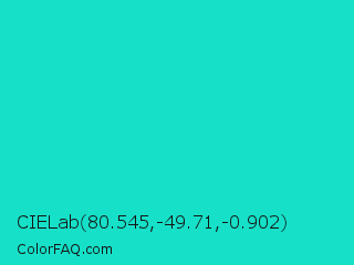 CIELab 80.545,-49.71,-0.902 Color is a normal cyan color and the nearest color is Bright Turquoise #08e8de. Hex code #16e0c8 and RGB value is rgb(22,224,200). In RGB color space, this color is composed of 9% red, 88% green, 78% blue, In CMYK color space, this color is composed of 90% cyan, 0% magenta, 11% yellow , 12% black , In HSL color space, this color has a hue angle of 173° , 82% saturation and 48% lightness.