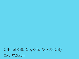 CIELab 80.55,-25.22,-22.58 Color is a light cyan color and the nearest color is Turquoise Blue #6cdae7. Hex code #64d7f1 and RGB value is rgb(100,215,241). In RGB color space, this color is composed of 39% red, 84% green, 95% blue, In CMYK color space, this color is composed of 59% cyan, 11% magenta, 0% yellow , 5% black , In HSL color space, this color has a hue angle of 191° , 83% saturation and 67% lightness.