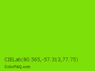 CIELab 80.565,-57.313,77.75 Color is a normal green color and the nearest color is Alien Armpit #84de02. Hex code #7de008 and RGB value is rgb(125,224,8). In RGB color space, this color is composed of 49% red, 88% green, 3% blue, In CMYK color space, this color is composed of 44% cyan, 0% magenta, 96% yellow , 12% black , In HSL color space, this color has a hue angle of 88° , 93% saturation and 45% lightness.