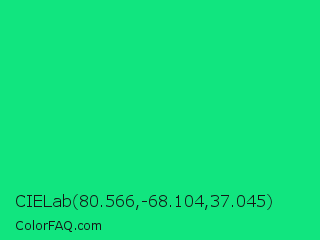 CIELab 80.566,-68.104,37.045 Color is a normal green color and the nearest color is Spring Green #00ff7f. Hex code #11e57f and RGB value is rgb(17,229,127). In RGB color space, this color is composed of 7% red, 90% green, 50% blue, In CMYK color space, this color is composed of 93% cyan, 0% magenta, 45% yellow , 10% black , In HSL color space, this color has a hue angle of 151° , 86% saturation and 48% lightness.