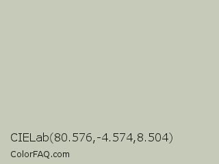 CIELab 80.576,-4.574,8.504 Color is a light lime color and the nearest color is Foggy Gray #cbcab6. Hex code #c6cab8 and RGB value is rgb(198,202,184). In RGB color space, this color is composed of 78% red, 79% green, 72% blue, In CMYK color space, this color is composed of 2% cyan, 0% magenta, 9% yellow , 21% black , In HSL color space, this color has a hue angle of 73° , 15% saturation and 76% lightness.