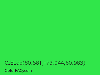 CIELab 80.581,-73.044,60.983 Color is a normal green color and the nearest color is Lime Green #32cd32. Hex code #30e64a and RGB value is rgb(48,230,74). In RGB color space, this color is composed of 19% red, 90% green, 29% blue, In CMYK color space, this color is composed of 79% cyan, 0% magenta, 68% yellow , 10% black , In HSL color space, this color has a hue angle of 129° , 78% saturation and 55% lightness.