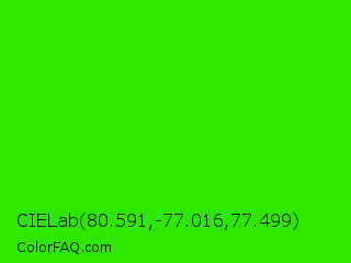 CIELab 80.591,-77.016,77.499 Color is a normal green color and the nearest color is Harlequin #3fff00. Hex code #2ee701 and RGB value is rgb(46,231,1). In RGB color space, this color is composed of 18% red, 91% green, 0% blue, In CMYK color space, this color is composed of 80% cyan, 0% magenta, 100% yellow , 9% black , In HSL color space, this color has a hue angle of 108° , 99% saturation and 45% lightness.