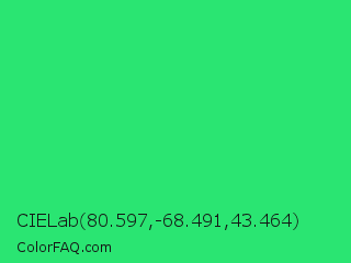 CIELab 80.597,-68.491,43.464 Color is a normal green color and the nearest color is UFO Green #3cd070. Hex code #2ae572 and RGB value is rgb(42,229,114). In RGB color space, this color is composed of 16% red, 90% green, 45% blue, In CMYK color space, this color is composed of 82% cyan, 0% magenta, 50% yellow , 10% black , In HSL color space, this color has a hue angle of 143° , 78% saturation and 53% lightness.