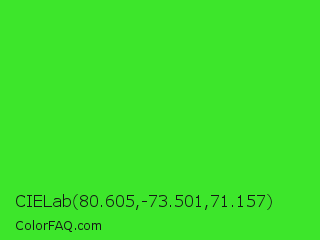 CIELab 80.605,-73.501,71.157 Color is a normal green color and the nearest color is Lime Green #32cd32. Hex code #3de62b and RGB value is rgb(61,230,43). In RGB color space, this color is composed of 24% red, 90% green, 17% blue, In CMYK color space, this color is composed of 73% cyan, 0% magenta, 81% yellow , 10% black , In HSL color space, this color has a hue angle of 114° , 79% saturation and 54% lightness.
