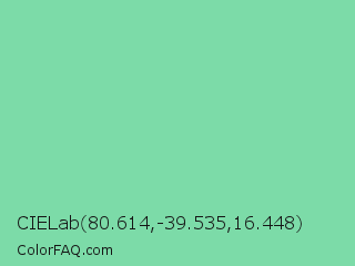 CIELab 80.614,-39.535,16.448 Color is a light green color and the nearest color is Medium Aquamarine #66ddaa. Hex code #7cdba8 and RGB value is rgb(124,219,168). In RGB color space, this color is composed of 49% red, 86% green, 66% blue, In CMYK color space, this color is composed of 43% cyan, 0% magenta, 23% yellow , 14% black , In HSL color space, this color has a hue angle of 148° , 57% saturation and 67% lightness.