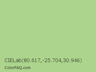 CIELab 80.617,-25.704,30.946 Color is a light green color and the nearest color is Feijoa #9fdd8c. Hex code #acd48d and RGB value is rgb(172,212,141). In RGB color space, this color is composed of 67% red, 83% green, 55% blue, In CMYK color space, this color is composed of 19% cyan, 0% magenta, 33% yellow , 17% black , In HSL color space, this color has a hue angle of 94° , 45% saturation and 69% lightness.