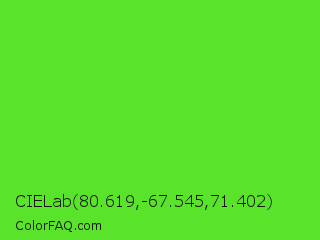 CIELab 80.619,-67.545,71.402 Color is a normal green color and the nearest color is Harlequin Green #46cb18. Hex code #59e42b and RGB value is rgb(89,228,43). In RGB color space, this color is composed of 35% red, 89% green, 17% blue, In CMYK color space, this color is composed of 61% cyan, 0% magenta, 81% yellow , 11% black , In HSL color space, this color has a hue angle of 105° , 77% saturation and 53% lightness.