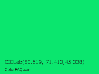 CIELab 80.619,-71.413,45.338 Color is a normal green color and the nearest color is Malachite #0bda51. Hex code #0ae66e and RGB value is rgb(10,230,110). In RGB color space, this color is composed of 4% red, 90% green, 43% blue, In CMYK color space, this color is composed of 96% cyan, 0% magenta, 52% yellow , 10% black , In HSL color space, this color has a hue angle of 147° , 92% saturation and 47% lightness.