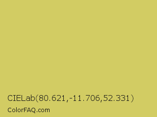 CIELab 80.621,-11.706,52.331 Color is a light yellow color and the nearest color is Tacha #d6c562. Hex code #d2cc63 and RGB value is rgb(210,204,99). In RGB color space, this color is composed of 82% red, 80% green, 39% blue, In CMYK color space, this color is composed of 0% cyan, 3% magenta, 53% yellow , 18% black , In HSL color space, this color has a hue angle of 57° , 55% saturation and 61% lightness.