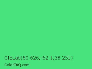 CIELab 80.626,-62.1,38.251 Color is a normal green color and the nearest color is UFO Green #3cd070. Hex code #48e37d and RGB value is rgb(72,227,125). In RGB color space, this color is composed of 28% red, 89% green, 49% blue, In CMYK color space, this color is composed of 68% cyan, 0% magenta, 45% yellow , 11% black , In HSL color space, this color has a hue angle of 141° , 73% saturation and 59% lightness.