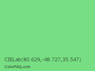 CIELab 80.629,-48.727,35.547 Color is a light green color and the nearest color is Pastel Green #77dd77. Hex code #77de83 and RGB value is rgb(119,222,131). In RGB color space, this color is composed of 47% red, 87% green, 51% blue, In CMYK color space, this color is composed of 46% cyan, 0% magenta, 41% yellow , 13% black , In HSL color space, this color has a hue angle of 127° , 61% saturation and 67% lightness.