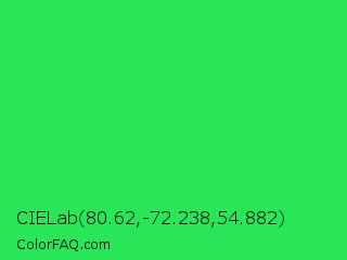 CIELab 80.62,-72.238,54.882 Color is a normal green color and the nearest color is Malachite #0bda51. Hex code #29e659 and RGB value is rgb(41,230,89). In RGB color space, this color is composed of 16% red, 90% green, 35% blue, In CMYK color space, this color is composed of 82% cyan, 0% magenta, 61% yellow , 10% black , In HSL color space, this color has a hue angle of 135° , 79% saturation and 53% lightness.