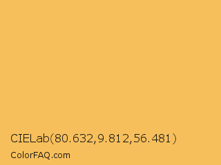 CIELab 80.632,9.812,56.481 Color is a light orange color and the nearest color is Saffron Mango #f9bf58. Hex code #f7bf5c and RGB value is rgb(247,191,92). In RGB color space, this color is composed of 97% red, 75% green, 36% blue, In CMYK color space, this color is composed of 0% cyan, 23% magenta, 63% yellow , 3% black , In HSL color space, this color has a hue angle of 38° , 91% saturation and 66% lightness.