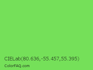 CIELab 80.636,-55.457,55.395 Color is a light green color and the nearest color is Pastel Green #77dd77. Hex code #75e059 and RGB value is rgb(117,224,89). In RGB color space, this color is composed of 46% red, 88% green, 35% blue, In CMYK color space, this color is composed of 48% cyan, 0% magenta, 60% yellow , 12% black , In HSL color space, this color has a hue angle of 108° , 69% saturation and 61% lightness.