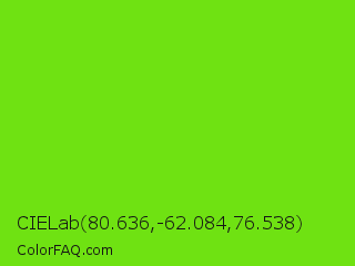 CIELab 80.636,-62.084,76.538 Color is a normal green color and the nearest color is Alien Armpit #84de02. Hex code #6fe212 and RGB value is rgb(111,226,18). In RGB color space, this color is composed of 44% red, 89% green, 7% blue, In CMYK color space, this color is composed of 51% cyan, 0% magenta, 92% yellow , 11% black , In HSL color space, this color has a hue angle of 93° , 85% saturation and 48% lightness.