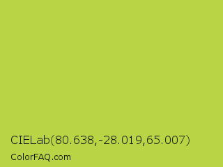 CIELab 80.638,-28.019,65.007 Color is a normal lime color and the nearest color is Conifer #acdd4d. Hex code #b9d444 and RGB value is rgb(185,212,68). In RGB color space, this color is composed of 73% red, 83% green, 27% blue, In CMYK color space, this color is composed of 13% cyan, 0% magenta, 68% yellow , 17% black , In HSL color space, this color has a hue angle of 71° , 63% saturation and 55% lightness.