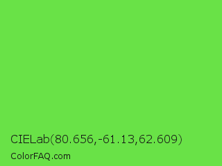 CIELab 80.656,-61.13,62.609 Color is a normal green color and the nearest color is Kiwi #8ee53f. Hex code #69e247 and RGB value is rgb(105,226,71). In RGB color space, this color is composed of 41% red, 89% green, 28% blue, In CMYK color space, this color is composed of 54% cyan, 0% magenta, 69% yellow , 11% black , In HSL color space, this color has a hue angle of 107° , 73% saturation and 58% lightness.