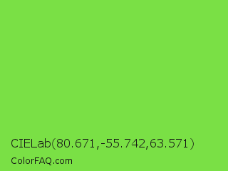 CIELab 80.671,-55.742,63.571 Color is a normal green color and the nearest color is Kiwi #8ee53f. Hex code #7ae045 and RGB value is rgb(122,224,69). In RGB color space, this color is composed of 48% red, 88% green, 27% blue, In CMYK color space, this color is composed of 46% cyan, 0% magenta, 69% yellow , 12% black , In HSL color space, this color has a hue angle of 99° , 71% saturation and 57% lightness.